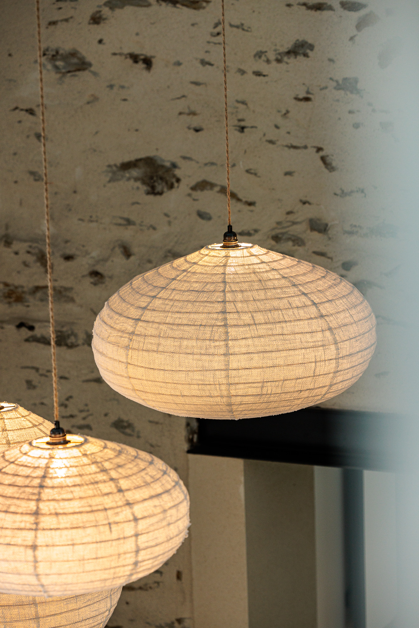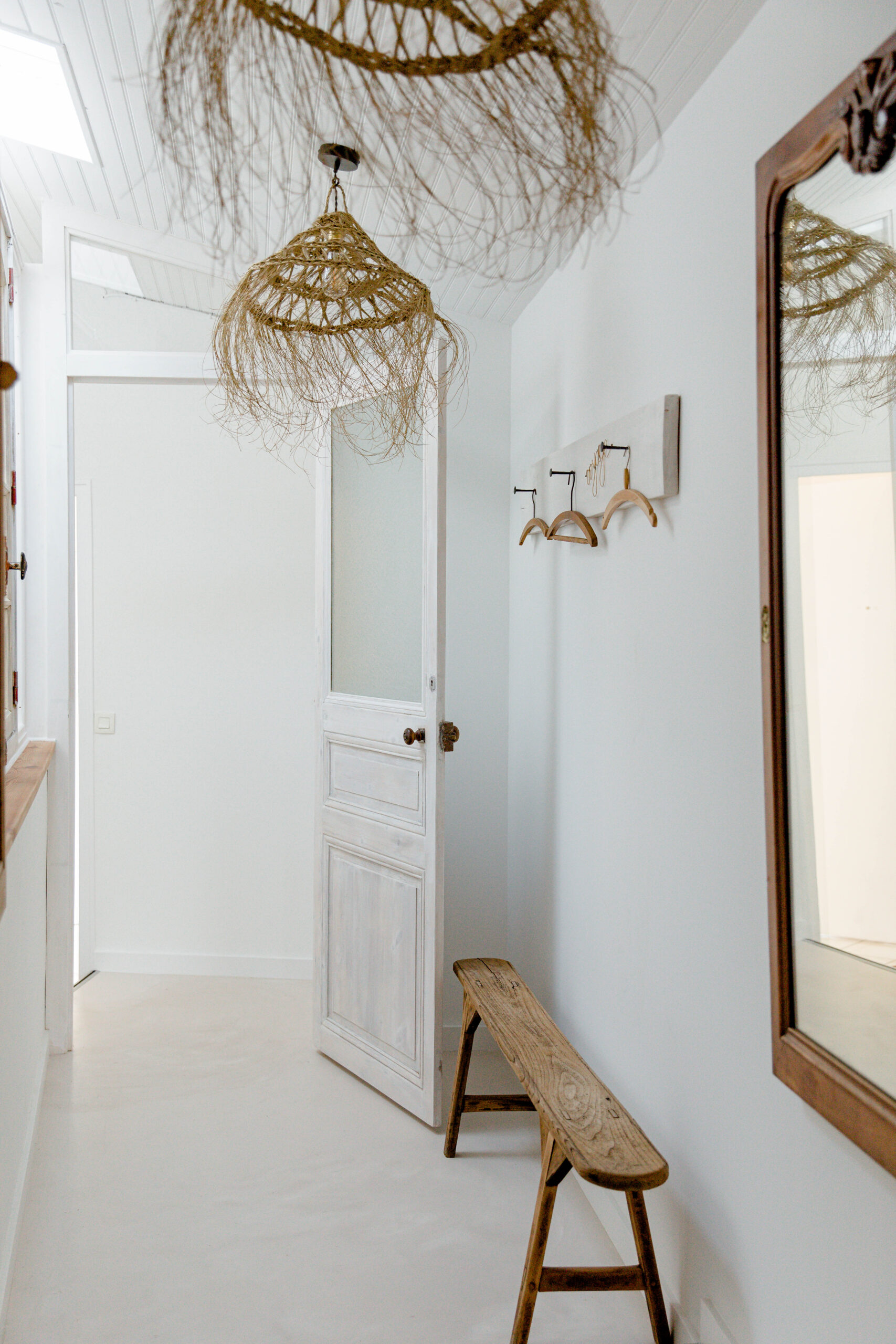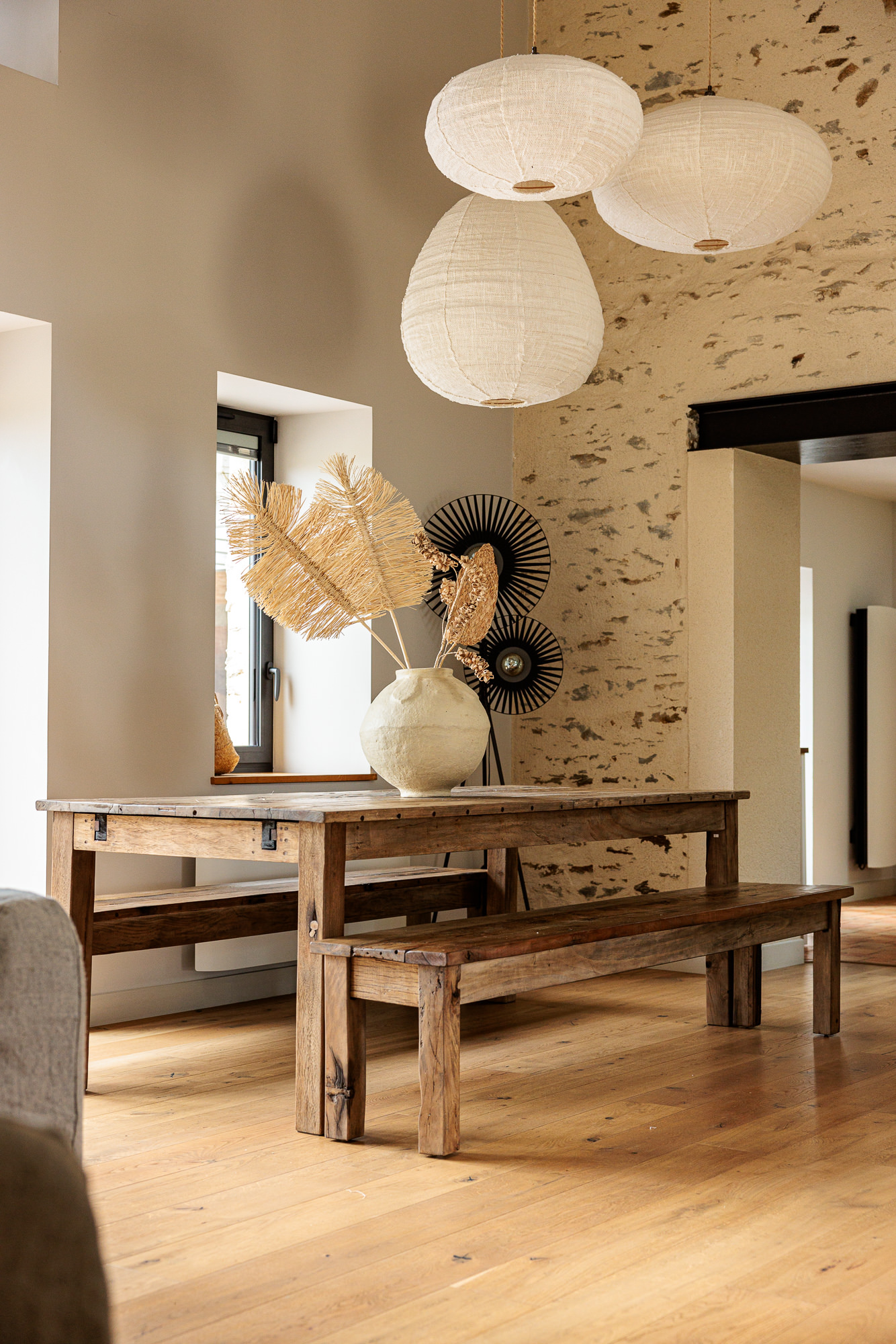 Attachés aux matières naturelles et au bois vieilli, les clients ont opté pour un mobilier authentique : canapé en lin, table et banc en bois de récupération, luminaires en fibres naturelles de kapok pour une ambiance douce et organique.