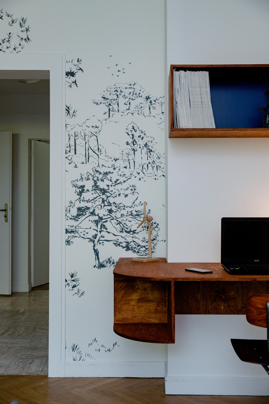 Le mobilier, réalisé sur mesure en contreplaqué puis patiné à la cire, complète cet équilibre entre fonctionnalité et esthétique.