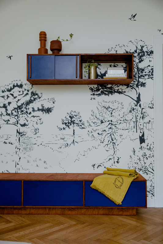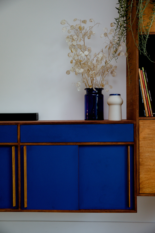 J’ai imaginé un mobilier sur mesure aux formes arrondies, mêlant bois chaleureux et bleu Klein, afin d’éviter le rangement traditionnel “cube” et conserver l’esprit du lieu.