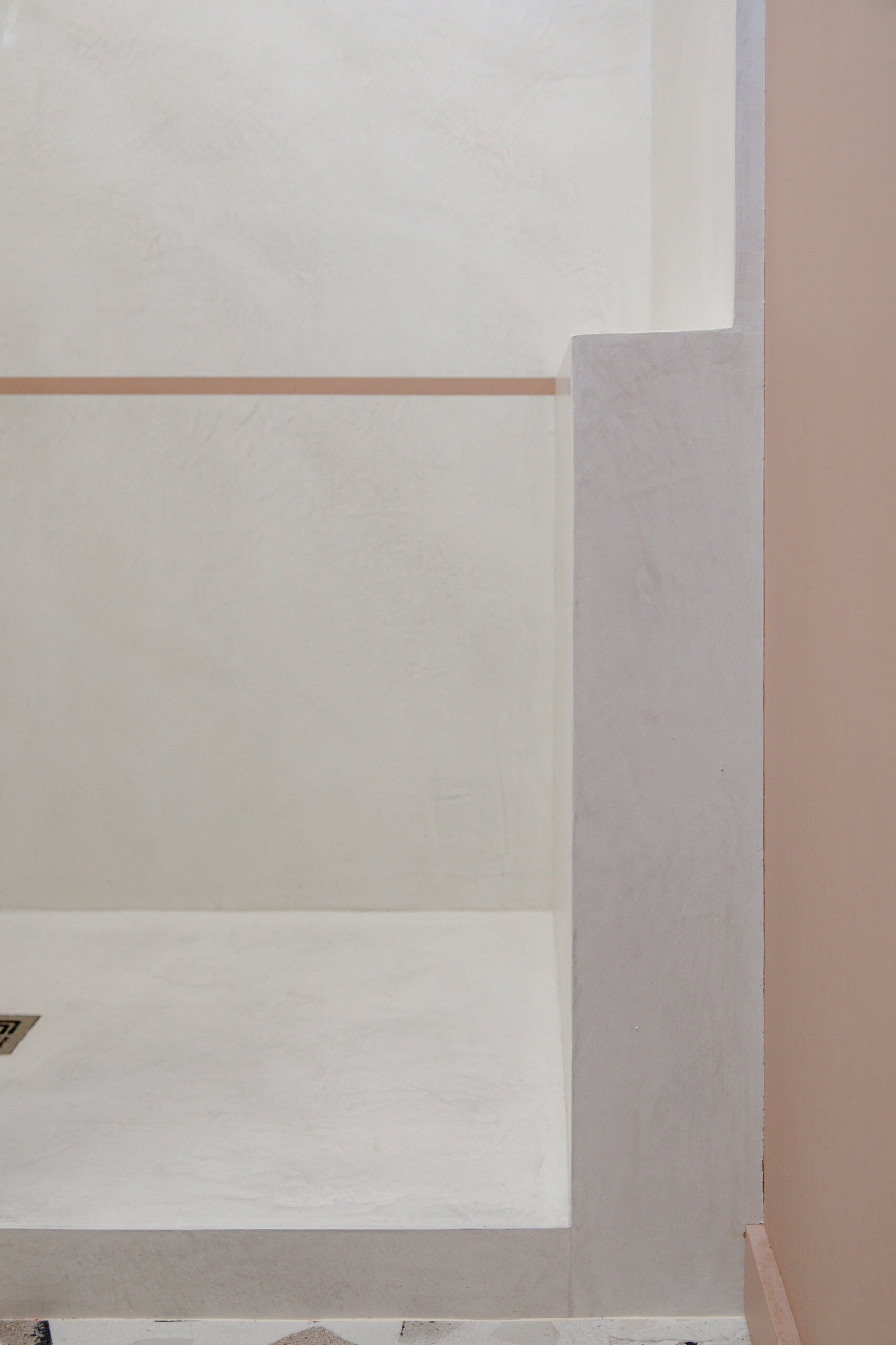 Les teintes ont été pensées dans une palette tendre et féminine : rose poudré pour les murs, béton blanc nacré à l’intérieur de la douche pour capter la lumière. Les robinetteries en laiton viennent réchauffer l’ensemble et structurer les lignes.